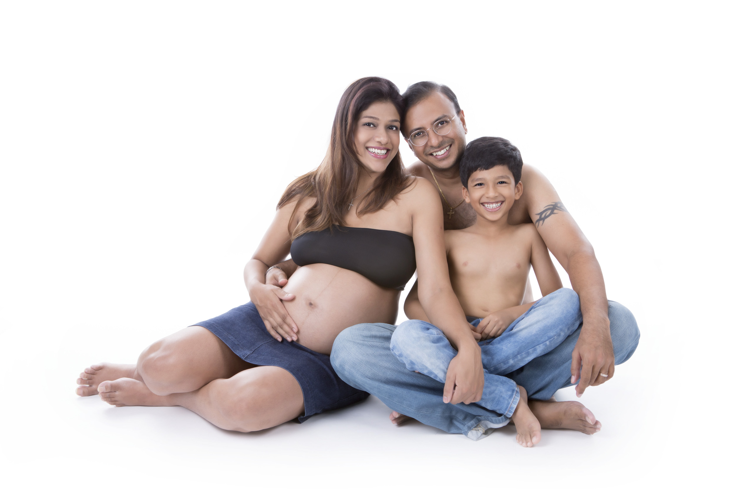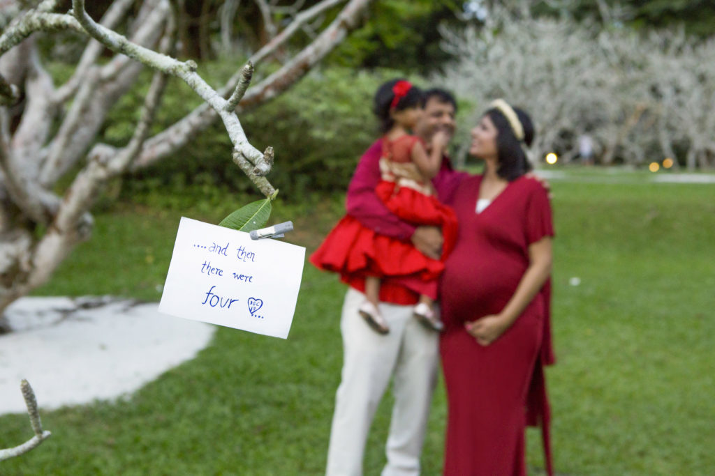 Ideally, a long dress or gown that showcases your belly nicely. If you are going for a casual look and feel in your shoot, you can try jeans and a tube top. If you are taking with your family (Spouse/ Significant Other/ Older Children), you can choose an outfit that would complement or match them in colours or style!